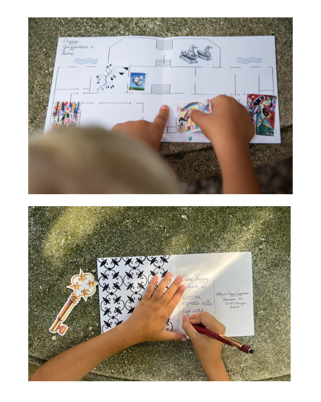 La dernière page détachable devient une carte postale que l’enfant peut adresser à Peggy Guggenheim.